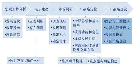 我們根據(jù)多年的工作經(jīng)驗,總結了自己使用的物流園區(qū)項目戰(zhàn)略規(guī)劃和定位研究的一般方法論(如下圖所示),并要做好以下工作: