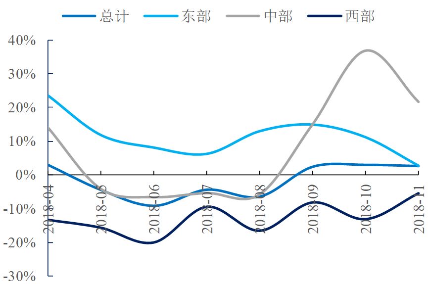 從鐵路切換到道路,道路投資在基建投資中占比較高。2018年1-10月道路固定資產投資共計3.59萬億萬億,在基建投資中占比達到31%。公路投資增速與資金面情況息息相關。2018Q2以來,西部地區公路投資降幅收窄,固定資產投資持續下滑。