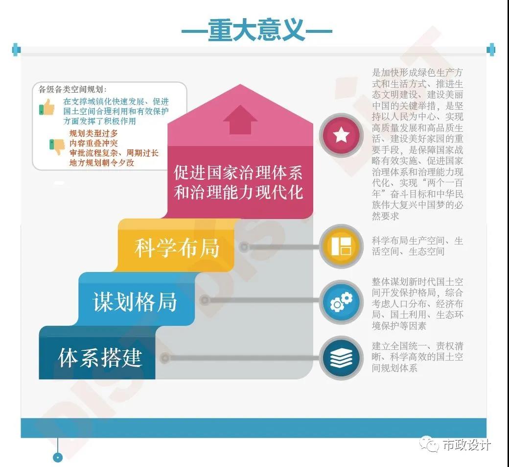 2019年5月23日,中共中央、國務院《關于建立國土空間規劃體系并監督實施的若干意見》正式印發,明確要建立國土空間規劃體系并監督實施,將主體功能區規劃、土地利用規劃、城鄉規劃等空間規劃融合為統一的國土空間規劃,實現“多規合一”,強化國土空間規劃對各專項規劃的指導約束作用。此舉是黨中央、國務院作出的重大部署。