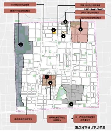 八個空間景觀節點包括:唱經樓周邊地段、永興路歷史社區、拱極門周邊地段、鐘鼓樓復建及周邊地段、壩陵北街歷史地段、工程隊舊址周邊地段、五一廣場周邊地段及文道設計、城西水系周邊地段。
