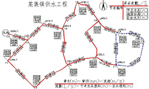 在計算該集鎮設計用水量之后,按照鴻業軟件平差下拉菜單中的項,做好管網定線、管材選擇、定節點地面標高、定節點流量、預賦管徑之后,從圖面提取管道信息軟件自動進行管網平差計算,根據計算結果調節預賦的各管段的管徑,使各個管段的流速盡量在經濟流速范圍內的管徑,即為最適管徑,平差結束。本工程給水管網平差結果及供水管網平差圖(圖4)如下。