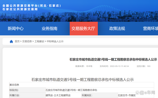 石家莊市城市軌道交通5號線一期工程設(shè)計總承包中標(biāo)候選人公示