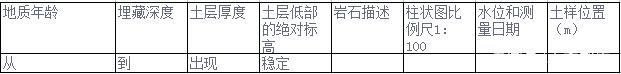 鉆孔地質(zhì)柱狀圖是表示該鉆孔所穿過的地層而綜合成圖表表示。圖中表示有地質(zhì)年代、土層埋藏深度、土層厚度、土層底部的絕對標(biāo)高、巖土的描述、柱狀圖、地面絕對標(biāo)高、地下水水位和測量日期、巖土怎樣選取位置等。柱狀圖的比例尺一般為1:100—1:500。