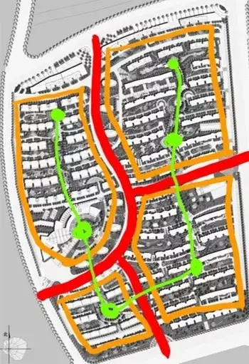 強(qiáng)調(diào)南北主線, 通過(guò)錯(cuò)開(kāi)的方式獲得變化,內(nèi)部加入環(huán)形路聯(lián)系四個(gè)組團(tuán)中心,適合低密度產(chǎn)品。
